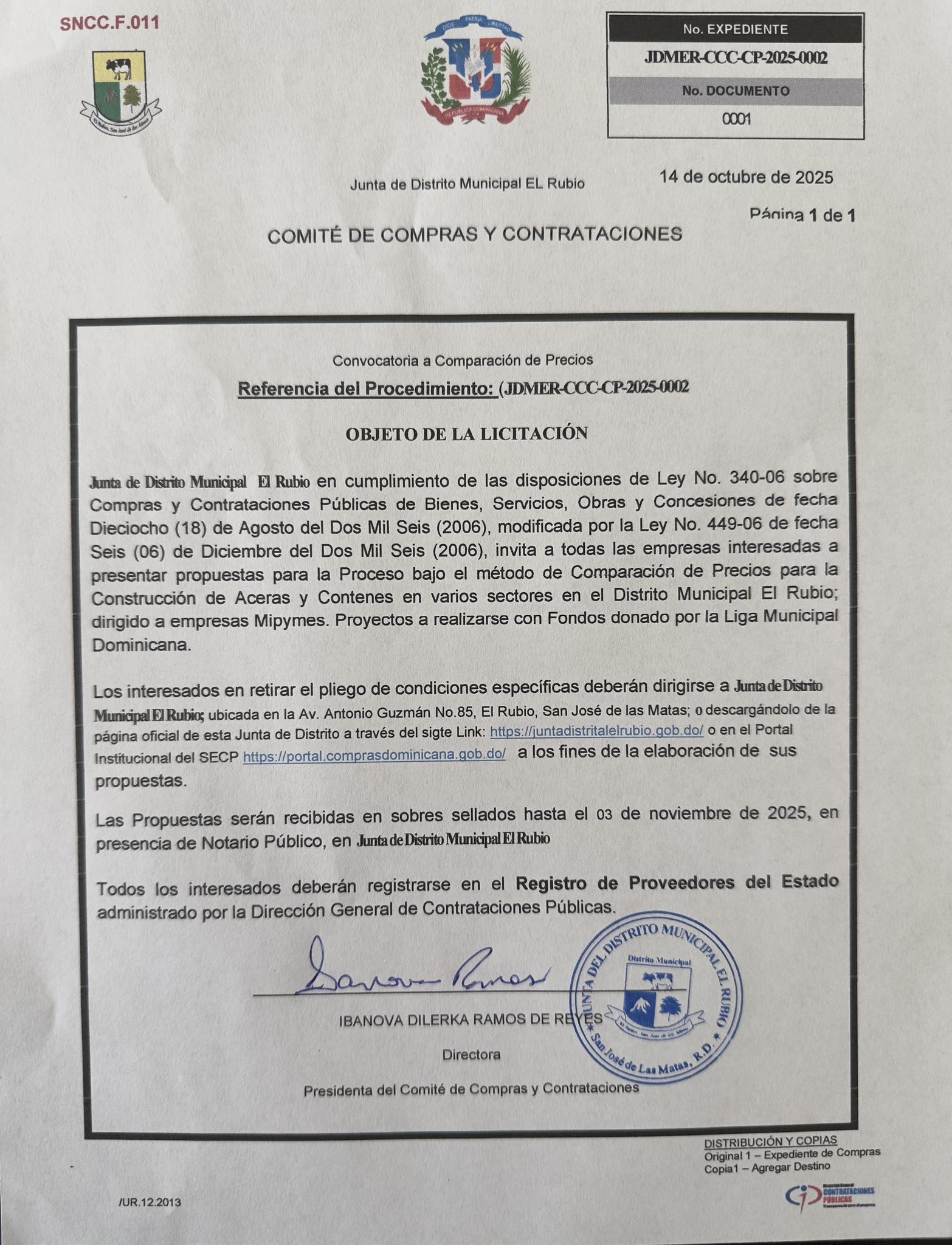 📅 El Rubio, 14 de octubre de 2025 — En cumplimiento de la Ley 340-06 sobre Compras y Contrataciones Públicas, la Junta del Distrito Municipal El Rubio, bajo la dirección de la Licda. Ibanova Dilerka Ramos de Reyes, anuncia la apertura del proceso de licitación mediante comparación de precios para la construcción de aceras y contenes en sectores del distrito.